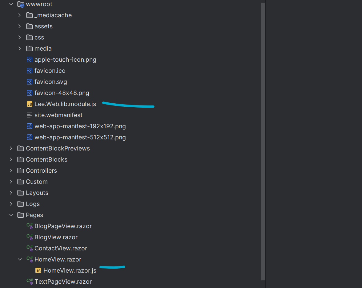 Now you have this script in your wwwroot, you now want to create an inline / isolated JS page for one of your Blazor pages or components. All you do is create a .JS file with the same name as the component, but end with .js. As you can see from the image, I have created it under my HomeView.razor (My home page) and created a file called HomeView.razor.js. Your IDE should nest or connect the files.